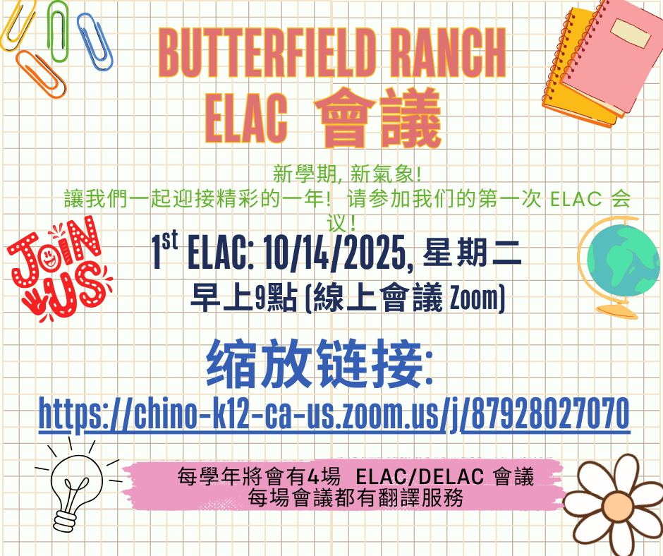 We will have our first ELAC (English Learner Advisory Committee) meeting on Tuesday, October 14th, at 9:00 a.m. via Zoom.